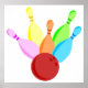 Illustration simple des quilles de bowling à dix broches colorées abattues par une boule de bowling. Image disponible sur divers cadeaux et produits. Posters. Tirages.