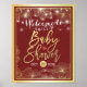 Modèles d'affiche de bienvenue pour Baby Shower - Écriture élégante et cadre floral doré vintage sur fond damassé rouge. Tous les styles de texte, couleurs et tailles peuvent être modifiés pour répondre à vos besoins !