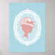 La silhouette rose d'une belle femme dans un casquette époustouflant, est dans un cadre blanc orné. L'arrière - plan est doux, bleu clair, avec de petits pois plus légers.