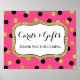 Affiche de pancarte cartes et cadeaux pour une baby shower, une douche de mariée ou un mariage en rose fuchsia chaud avec motif de points dorés et noirs, veuillez noter que l'or est uniquement un effet photographique.