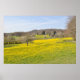Champs couverts de pissenlits jaunes, avec au loin le petit hameau de la Royere, et cerisiers sauvages en fleurs.