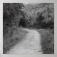 Photo en noir et blanc d'un chemin de terre serpentant dans une zone boisée