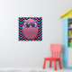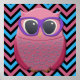 Poster adorable avec une chouette rose, portant des lunettes violettes et assis sur un motif de chevron zigzag rose et bleu