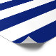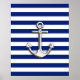 A silver chrome like anchor applique on a horizontal navy blue style stripes print decor for a perfect nautical look.