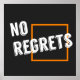 Ce design graphique amusant comporte un carré orange vif et les mots "No Regrets" superposés dans une police de bloc d'ombre blanche et en gras, tous contrastés par rapport à un arrière - plan noir.