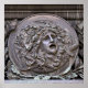 La tête de Gorgon Medusa brisée et criée, ainsi que deux lames et un satyre souriant sur le bouclier d'Athéna. Les feuilles de Laurel, symboles de victoire liés à Athéna, encadrent le bouclier.