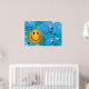 Une affiche inspirante représentant une boule jaune souriante dans une mer de boules bleues qui fronce les sourcils et représentant l'importance de garder un sens de l'optimisme et de l'humour.
