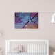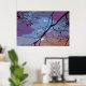 Cette affiche d'art présente un motif abstrait de branches noires contre un ciel couché de soleil aux couleurs arc-en-ciel de violet, bleu, blanc, rose, orange, gris et magenta.
