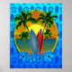 Beau coucher de soleil sur la plage derrière des planches de surf et des palmiers, encadrés de bambous et de fleurs d'hibiscus. Avec un arrière - plan bleu océanique de tortues de mer hawaïennes Honu et des masques de tiki.