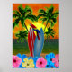 Coucher de soleil tropical et coloré sur l'océan, derrière des planches de surf, des palmiers, un perroquet macaw perché sur les planches de surf, et des fleurs d'hibiscus au fond.
