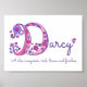 Joli poster avec monogramme D, parfait pour la chambre ou la salle de jeux d'une fille dans des tons de marine, blanc, rose et violet. Personnalisez avec le prénom court de votre enfant commençant par D, et la signification du nom pour un effet vraiment personnalisé dans la chambre ou la nurserie de votre enfant, cet exemple est pour le nom Darcy Une conquérante chic, riche, courageuse et intrépide. Jolie impression idéale pour un nouveau-né, un cadeau de baptême ou de baby shower. © Dessin unique de cœurs et de fleurs avec monogramme D et conception graphique par Sarah Trett. www.sarahtrett.com pour www.mylittleeden.com
