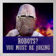 Vue rapprochée d'un casque et d'une armure en plaque d'un chevalier médiéval contre l'arrière - plan coloré qui imite l'espace extra-atmosphérique ou un champ de bataille à votre goût. Texte - Robots ? Vous devez plaisanter - ajouté
