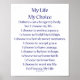 L'affiche d'art sur le diabète présente le poème de soutien inspirant "Ma vie, mon choix" pour le diabète. Créez des affiches personnalisées de sensibilisation au diabète et imprimez des affiches en utilisant des options personnalisées pour montrer votre sensibilisation au diabète chez les jeunes diabétiques de type 1 ou 2. Donnez à quelqu'un un poème spécial sur le diabète, affiche des cadeaux. Ma vie, mon choix Le diabète peut changer mon corps, mais je choisis ma vie... Je choisis d'embrasser la paix. Je choisis de construire des amitiés. J'ai choisi de chérir de doux souvenirs. Je choisis d'accepter la grâce. Je choisis d'avoir du courage. Je choisis de croire en l'espoir. Je choisis de saluer la foi. Je choisis de connaître l'amour. Je choisis de vouloir ma vie. Sentez la beauté, ma vie - Par Laurel Latto