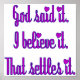 Des lettres violettes lisent "Dieu l'a dit. Je le crois. Ça règle la question." Des cœurs parsèment les i. Une façon amusante de montrer votre amour pour votre religion et votre foi en Dieu. Cadeau idéal pour les mariages, les ordinations, les baptêmes, les premières communions, les confirmations et n'importe quel jour saint. Également merveilleux pour Noël, Pâques et les anniversaires.