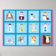Cette affiche a des griffes différentes pour différents carrés de neige, art de Kristie Hubler, a 12 parcelles de carrés, chacun avec une neige différente "folk", bonhomme de neige, femme des neiges, enfant des neiges, hommes des neiges, ou des configurations de famille des neiges, avec un mot d'art / slogan / texte pour stimuler la conversation