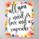 Une élégante enseigne de mariage à la pointe, avec le texte "Tout ce dont vous avez besoin, c'est d'amour et d'un cupcake" dans une police de caractères script extrovertie, la texture de la brosse ajoute une sensation spontanée et ludique. La couleur de fond peut être personnalisée en fonction de vos besoins et préférences, veuillez me contacter si vous avez une demande spéciale.