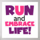 Si vous aimez courir, courir 5Ks, 10Ks, demi-marathons ou marathons, vous adorerez ce texte coloré en violet et rose qui lit Run and Embrace Life ! Cours et Embrassez des T-shirts, des tasses, des sacs, des cartes, des autocollants, des porte - clés, des mousepads, des coques iphone, des magnets et bien plus encore !