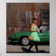 Affiches Femme marchant près d'une vieille voiture et d'un