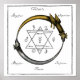 Winged dragon and snake biting each other's tail in the shape of the ouroboros, symbol of the opposing silver and gold forces harnessed to transmute lead into gold. Alchemy sigils for Sulphur and Mercury ☿ are shown in the center of the Star of David with the sun, moon and planet symbols. Printed in "The Golden Chain of Homer, or A Description of Nature and Natural Things" (1723). © dotpattern
