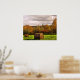 Cette affiche d'art présente un beau paysage d'automne dans des couleurs saisonnières de feuillage d'automne de rouge, orange, jaune, marron et vert. Une tempête est passée et le soleil traverse les nuages sur un terrain de pelouse avec des balles rondes de foin.