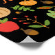 Decorative Autumn/Fall poster with nature designs. Apples, pumpkins, squash, berries, mushrooms, leaves. Black background.