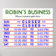 Plutôt que d'afficher les mêmes "heures de magasin" génériques que tout le monde a, pourquoi ne pas donner à votre entreprise une touche de classe supplémentaire en utilisant un signe qui a le nom de VOTRE entreprise imprimé dessus? Le modèle utilise par exemple "Bob's Business". Pour customiser le panneau, cliquez sur la zone de texte qui se lit "Robin's Business" et remplacez le texte par le nom de votre entreprise. (Si votre nom d'entreprise est trop grand pour tenir dans une ligne, vous pouvez réduire la taille de police. Vous pouvez également modifier la police en sélectionnant l'une des douzaines de choix disponibles de Zazzle.) La deuxième zone de texte concerne le slogan commercial. Cliquez sur l'encadré "Où les affaires sont faites" et remplacez le texte par un slogan pour votre entreprise. Si vous préférez ne pas avoir de slogan, vous pouvez supprimer la zone de texte du slogan ou simplement la laisser vide. Pour afficher les heures de votre magasin, vous devez cliquer sur chaque zone de texte qui affiche une heure de la journée et remplacer les heures dactylographiées par les heures d'ouverture et de fermeture correctes de votre entreprise. Le mot "CLOSED" s'affiche sous forme de fichier image. Il est affiché deux fois sur l'exemple par défaut, mais il y a en fait QUATRE copies de l'image "FERMÉE" disponible. (Deux sont visibles parce que deux autres sont derrière les deux qui sont visibles.) Faites glisser soigneusement les images "FERMÉES" vers les jours où vous êtes réellement fermé. Si vous êtes fermé moins de quatre jours par semaine, vous pouvez supprimer autant d'images "FERMÉES" que nécessaire. Si votre entreprise est ouverte tous les jours, vous pouvez les supprimer tous les quatre. Une fois que vous avez terminé, examinez soigneusement votre conception pour déceler toute erreur possible. Si vous êtes sûr d'avoir votre signe à l'image de ce que vous voulez, cliquez sur le bouton "commander".