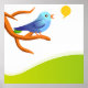 imagem de passarinho nas cores de dois azuis emando numa arvore e olhando para o sol