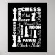 Un design de style typographique amusant pour tous ceux qui aiment jouer aux échecs. La typographie comprend les noms des pièces d'échecs et d'autres termes d'échecs avec les silhouettes des six pièces différentes : roi, reine, chevalier, évêque, tour et pion.