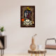 À l'aide d'un mélange intrigant de couleurs, de textures et d'éclairage, cette affiche représente la tradition mexicaine d'un autel honorant un être cher disparu. En attendant l'ajout d'autres offrandes de vous et de vos invités, exposés jusqu'à présent sont 3 crânes décorés, un jack-o-lanterne, une bougie en feu, et une image colorée peinte de l'esprit amoureux de la bien-aimée avec un oiseau jaune dans ses cheveux. Décor parfait pour Dia De Los Muerte, All Souls Night, Halloween ou juste parce que vous aimez les crânes et l'art décalé!