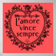 Beau arrière - plan corallien, illustration audacieuse d'un coeur aux tourbillons. Le texte se lit L'amore vince sempre. C'est italien pour l'amour qui conquiert tous. Nous avons ajouté la traduction anglaise en petits caractères au fond du coeur. Cette belle impression ferait une belle décoration mariage ou un cadeau mariage. Affichez-le dans votre maison, dans un bed and breakfast, donnez-le comme cadeau d'anniversaire. De Scarribaby Design, soutenu par la garantie Zazzle.