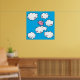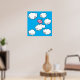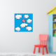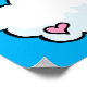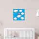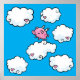 Une affiche joyeuse avec un cochon rose de dessin animé avec de petites ailes blanches, danse sur des nuages agrémentés de coeurs dans le ciel bleu vif.