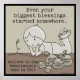 Little Boy regarde attentivement un plante qui s'envole en réalisant que "même vos plus grandes bénédictions ont commencé quelque part". Des paquets de semences et des sacs de semences avec des mots inspirants dessus s'assoient sur le côté. Christie Black illustre la brillante citation de David A. Carrizales, conférencier motivateur.