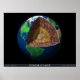 Les données sismiques de la Terre ont conduit à un modèle de l'intérieur qui le sépare en un noyau, un manteau et une croûte. La croûte est d'environ 30 kilomètres d'épaisseur. Le manteau a une épaisseur d'environ 2 840 kilomètres et le rayon central est d'environ 3 500 kilomètres. Chaque partition peut être divisée en régions plus petites. La croûte peut être classée comme océanique ou continentale, le manteau comme supérieur et inférieur, et le noyau comme liquide externe et solide interne. La croûte, le manteau, le noyau externe liquide et le noyau interne solide sont représentés dans cette vue de la terre.