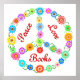 Partagez le plaisir des livres avec ce signe de paix en fleurs colorées et les mots - Peace Love Books.