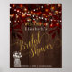 Affiche de douche nuptiale chic et classe avec lumières scintillantes rustiques, jarre de maçon avec fleurs blanches et feuilles d'automne rouille et script de calligraphie dorée "douche nuptiale" sur arrière - plan de bois de grange brune. Idéal pour votre automne de nuit | pays rustique douches à thème nuptiale.