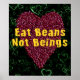 Le coeur fait de haricots rouges forme une toile de fond pour les mots "Mange des haricots pas des êtres" pour répandre le message que les créatures vivantes ne sont pas de la nourriture et nous devrions plutôt manger nos légumes.