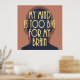 Nerdy et une affiche un peu rétro avec une bonne cuillère de nourriture du cerveau, combinée avec la typographie décorative. Le texte affirme que "MON ESPRIT EST TROP GRAND POUR MON CERVEAU", écrit sur la silhouette graphique de la tête d'une personne. La tête est affichée avec des couches d'arbre : la tête, son visage et l'ombre. Le texte est plus grand que la tête, et son contour simule même la forme de la tête de la personne. Beaucoup de nourriture pour le cerveau ici ! Notez que vous pouvez ajuster la couleur principale de l'arrière - plan ! Les couleurs calmes peuvent fonctionner mieux, mais même le chaux rose-choc ou vif sera aussi cool, si cela ajoute à votre chambre ! Les couleurs de la tête et du texte ne peuvent pas être ajustées, mais cette impression existe en deux variations de couleur. Si vous trouvez l'impression trop grande, vous pouvez simplement la redimensionner.