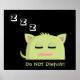 Une illustration mignonne et amusante d'un personnage de chatte endormi. Verte coloré avec des oreilles pointues et de petits touffes de cheveux sur sa tête avec des lèvres roses sans expressivité et une queue pointue. Les yeux se sont fermés, dormant profondément et ronflant avec un peu de zz au-dessus de sa tête. Ne dérange pas.
