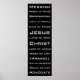 Affiche listant certains des noms les plus communs du Christ Jésus dans un style moderne. Conçu pour tenir 11 cadres 3/4 x 36".