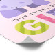 Nursery art print poster features an adorable violet purple hippo with flower and colorful patterned lettering. Includes pastel pink background color and "our sweet baby girl" text.