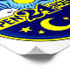 Design rétro avec la moitié d'un cercle affichant un design soleil et le fond un design lune. Au centre est "Ouvert 24 Heures". Couleurs bleues et jaunes