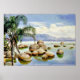 Peinture botanique de Marianne Nord - Palmiers et Boulders dans la baie de Rio, Brésil, affiche.
