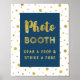 Pancarte de photomaton pour baby shower, mariage ou fête prénuptiale, en bleu nuit foncé et blanc avec confettis dorés et lettrage style écriture à la main. Parfait pour une baby shower, un mariage ou une fête prénuptiale.
