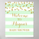 Bienvenue à l'affiche Baby shower avec nom personnalisé en vert menthe clair et rayures blanches motif avec effet parties scintillant or confetti, s'il vous plaît noter or est effet photographique seulement.