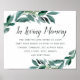 Conçu pour s'harmoniser avec notre collection de mariage à feuillage abondant, cet élégant panneau botanique est parfait pour être placé sur une table commémorative ou un présentoir en l'honneur des êtres chers disparus. Personnalisez l'en-tête et le corps du texte (représentés par "En souvenir aimant" et un court poème) encadrés de verdure et de feuilles d'eucalyptus peintes à l'aquarelle.