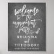 Panneau de bienvenue personnalisé pour fête de fiançailles avec noms et hashtag sur un fond à effet tableau noir.