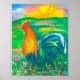 Une affiche colorée représentant une aquarelle d'un coq au lever du soleil, le soleil brillant se levant sur les collines des pré créant un ciel coloré et éveillant les couleurs dans les herbes et les fleurs sauvages.