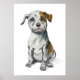 This work was done with pencil drawing and then colored digitally with conte and pastel. It is a drawing of a pit bull puppy sitting with a smile on his face. He has a very soft look on his face. He is white with tan patterns.