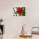 This beautiful print features a detailed photograph of a stunning red carnation flower. The photograph was taken using macro photography to show the beauty of this bright red bloom surrounded by green foliage.