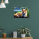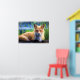 Une affiche avec une image animalière colorée d'un renard rouge posé dans des herbes vertes. Cette jolie créature a une fourrure douce et des yeux doux. L'image a une sensation magique de rêve.